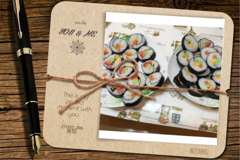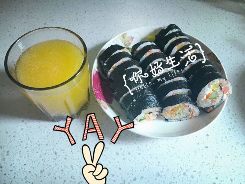 第一次做,经验不丰富,感觉米饭有点多,差点儿卷不起来。切的时候,每切一下都把刀沾一下水,这比较好切。配料可以根据个人喜好随意搭配。