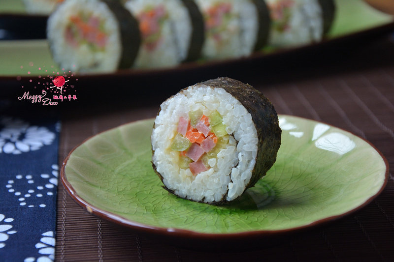 寿司醋适量;番茄沙拉酱适量;黄瓜适量;胡萝卜适量;火腿适量;咸鸭蛋适量;肉松适量;海苔卷适量;