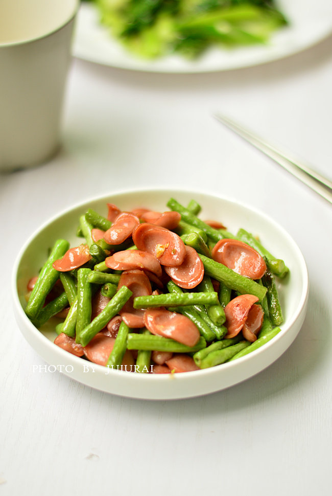 1:脆皮肠切片,豆角切段,蒜切末