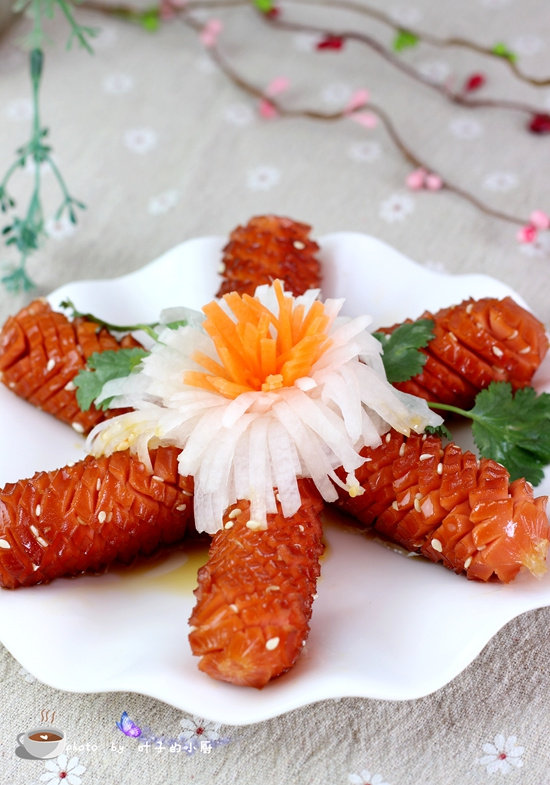 11:装点上萝卜花和香菜,美味的香煎脆皮肠做好了