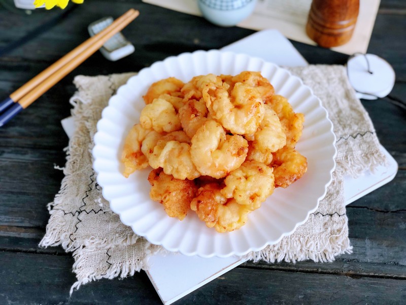 4:锅中倒入稍多油,烧热,插入一根筷子周围冒出细密的小气泡,转中火,腌制好的虾仁全身包裹面糊,下锅炸。