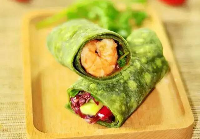 11:菠菜卷上放入黄瓜条、紫甘蓝丝、香菜段、虾仁椒丝。(如果可以的话淋点秦式甜辣酱)卷起来就可以吃了。