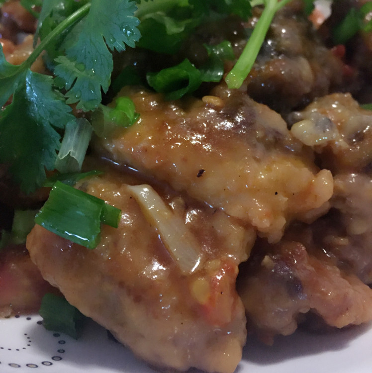 8:锅内加油,爆蒜头,加入西红柿,翻炒,加入炸好的排骨。加入少许水和生粉勾芡。