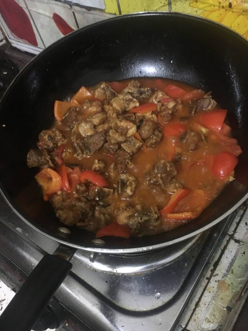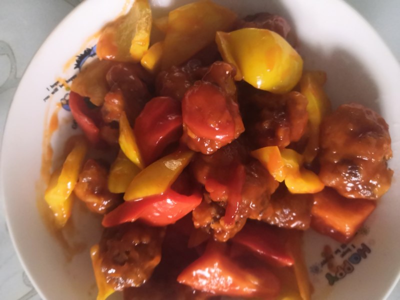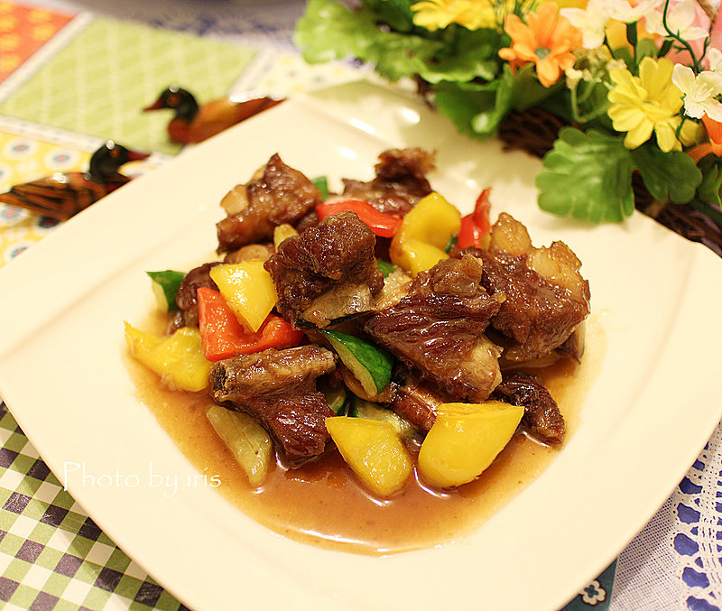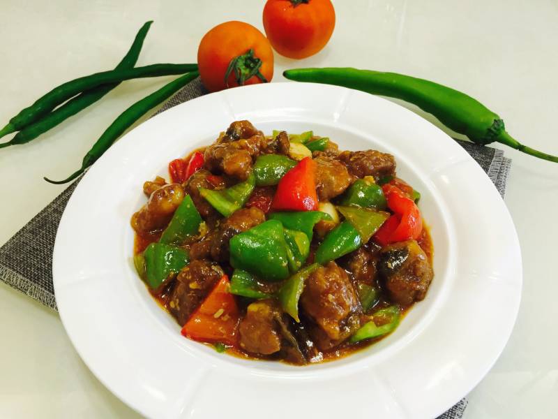 11:下甜椒跟排骨翻炒都粘上番茄酱。