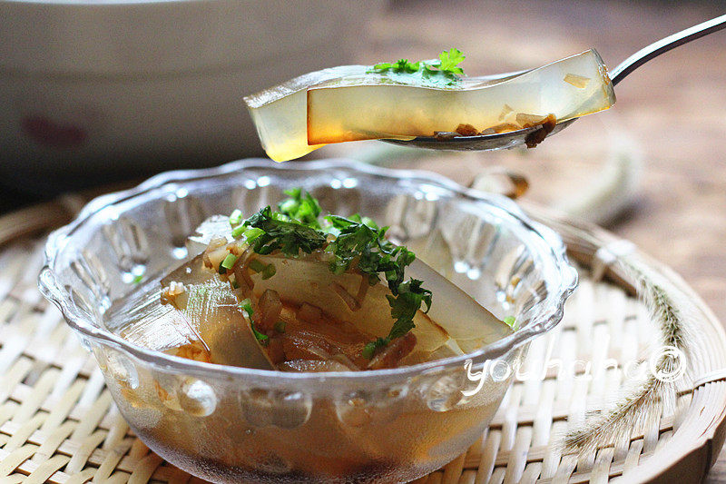 TIPS:1、酱汁里如果喜欢带点酸味,可以增加醋。2、海石花果冻用来做凉拌菜,胶质一定要浓稠点。3、如何判断海石花果冻液煮好了。可以用手指沾一些,两个手指一开一合,感到有满厚重黏黏的手感就可以了。4、野生黑籽海石花可以煮2到3次,第一次最浓稠,第二次,第三次最少,根据次数来测定加入的水的量。5、切海石花果冻的砧板生熟必须分开哦。