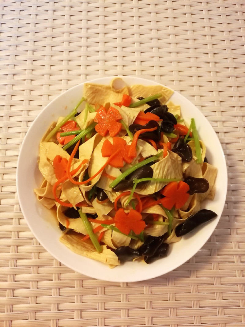1:豆皮和黑木耳分别用凉水泡发1小时。