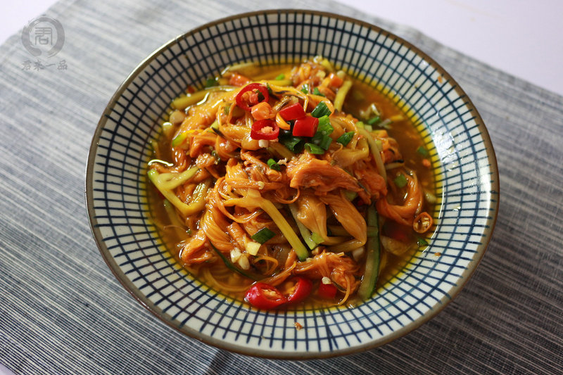 1:食材准备:主料:黄花菜、黄花菜辅料:芝麻油、自制凉拌酱、朝天椒、蒜末、葱花、陈醋、花椒粉黄花菜清水清洗后放入滚水中焯水,沥干备用。黄瓜切丝。