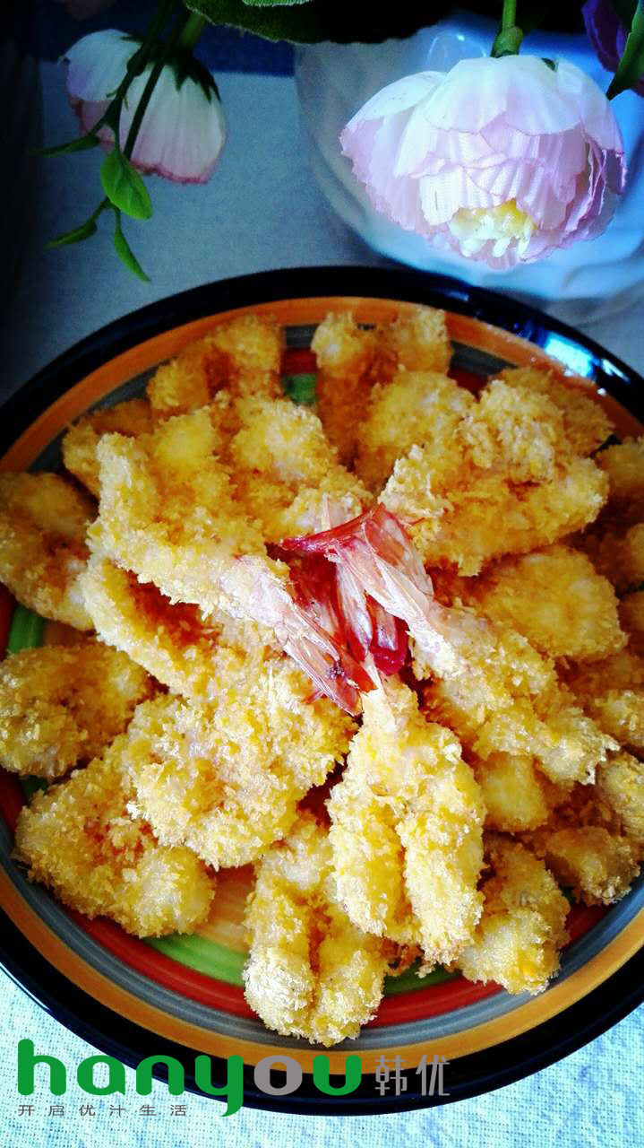 3:将鸡蛋打散成蛋液,把腌制好的虾裹上面粉再放入蛋液中再裹上面包糠