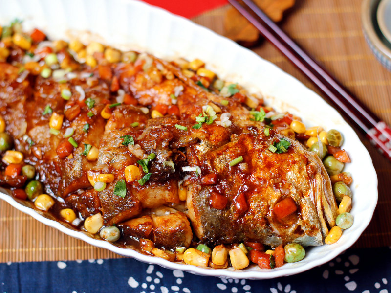 1:准备一条新鲜的大黄鱼。什锦菜就是冷冻袋装的玉米粒、青豆和胡萝卜丁。我用的淀粉是甘汁园的玉米淀粉,和土豆淀粉相比,玉米淀粉勾芡更透亮轻薄,口感顺滑,凉了也不会懈。