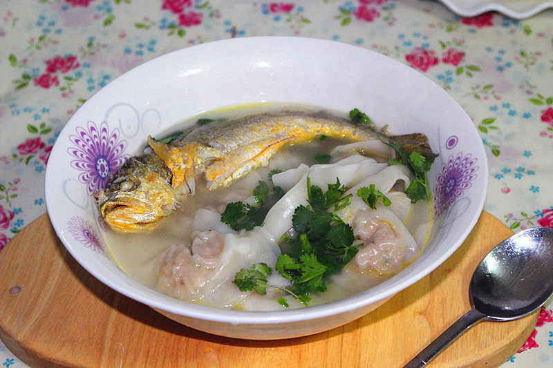 9:将馄饨捞入碗中,浇上黄鱼汤,放一条黄鱼,撒适量香菜即可。