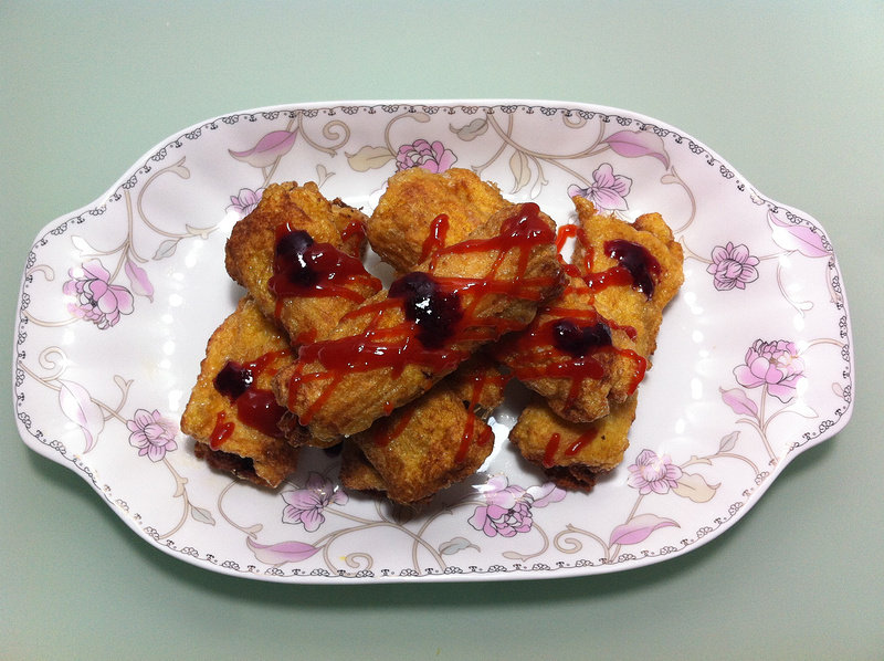 7:摆盘:捞出摆盘,淋上番茄酱和蓝莓果酱点缀~
