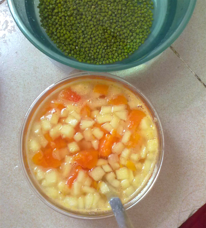 1:木瓜和苹果切小粒,熟食瓜果专用的砧板更卫生。