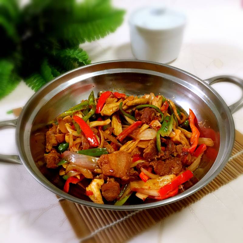 7:将红绿辣椒放入锅内煸炒,然后加入盐、味极鲜酱油,接着在关火前加入鸡精、香油煸炒匀均即可盛入干锅内。最后在炉内点一块酒精就可以开动啦。