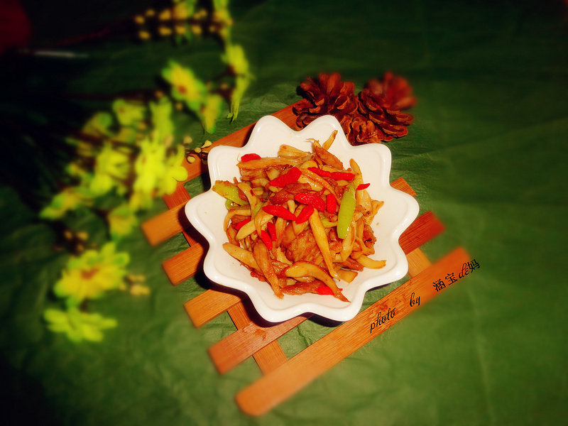 2:肉洗净切丝,放入胡椒粉、淀粉