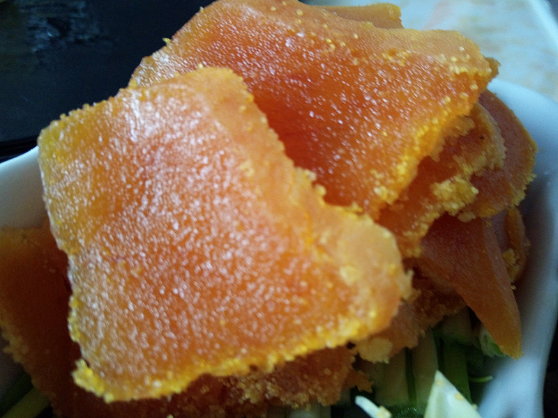 5:乌鱼子略凉后切片。吃的时候搭配青蒜片或蒜苗子切段或是白萝卜切片。也可以搭配梨片或苹果片,又是不同的滋味。