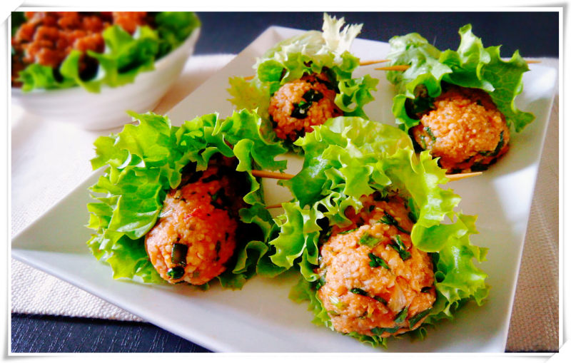 14:食用前拿出一些馅料捏成想要的形状,卷在生菜中,浇上些柠檬汁或石榴浓汁味道更好。