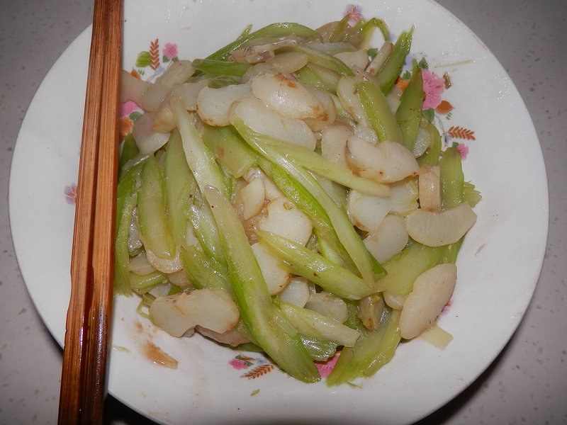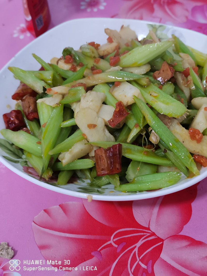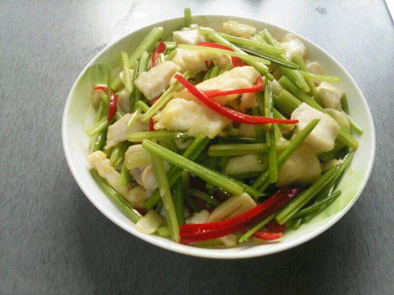 1:锅留底油,炒香芹菜,放红辣椒丝,放盐,味精调味。