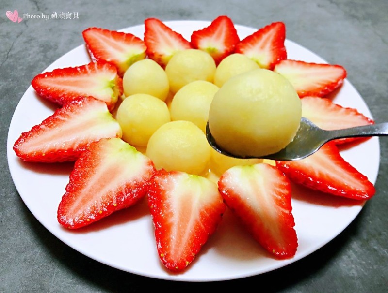 11:草莓一切为二摆在山药球的外侧瞬间颜值爆表。