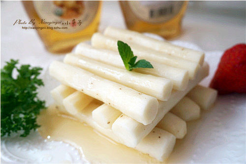 5:离火将山药棍取出摆盘,将适量的姜健宝糖姜汁淋在上面即成