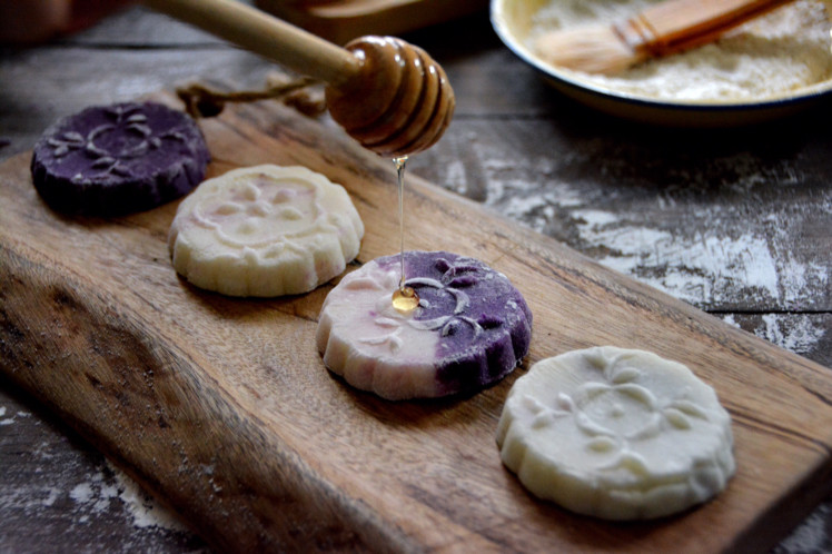 8:模具内先撒上炒熟的面粉,再将山药紫薯团放入,压出即可