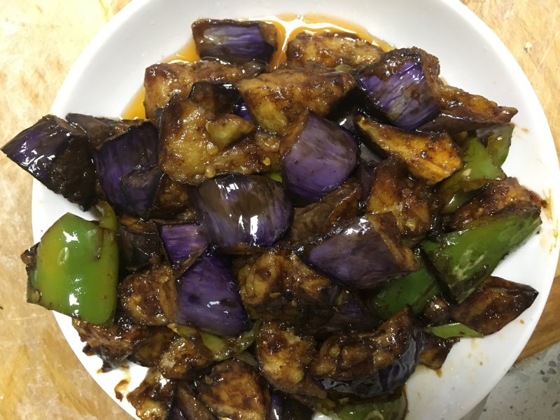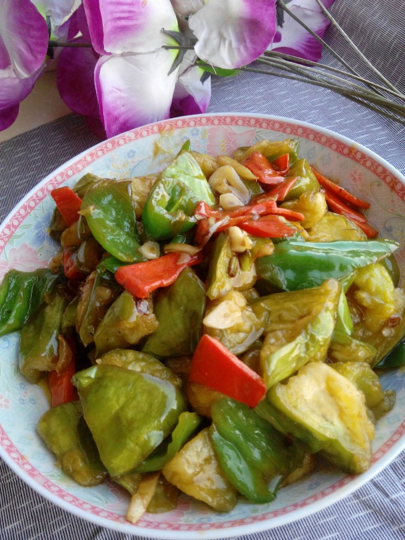 8:倒入茄子翻炒均匀,再加入青椒翻炒,然后倒入调好的酱汁,大火炒至收汁即可。