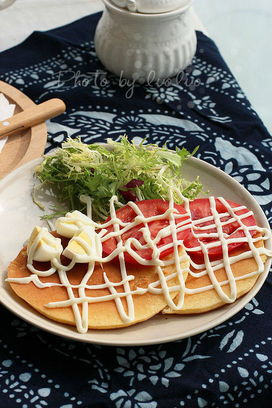 10:松饼摆盘,配上杂生菜、番茄、熟鸡蛋