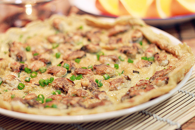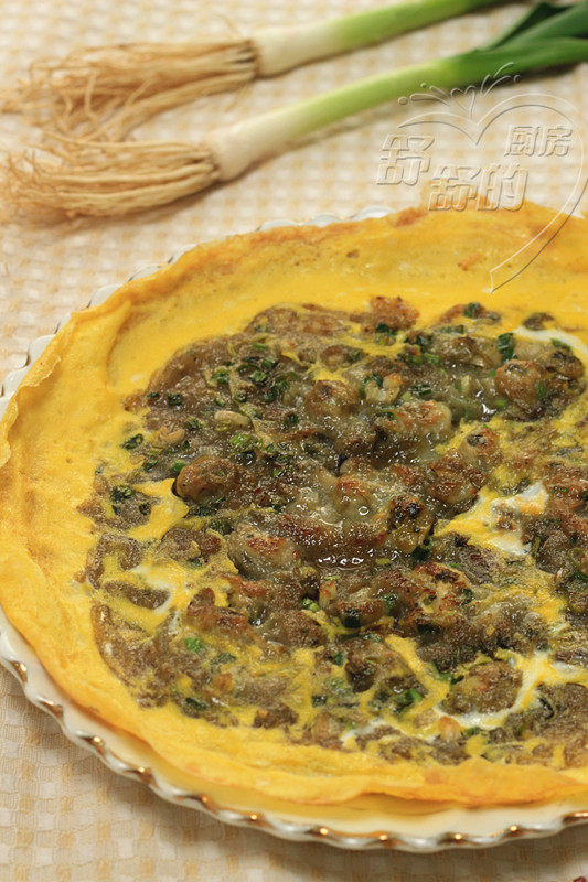 7:平底锅热油,倒入海蛎鸡蛋液摊平;