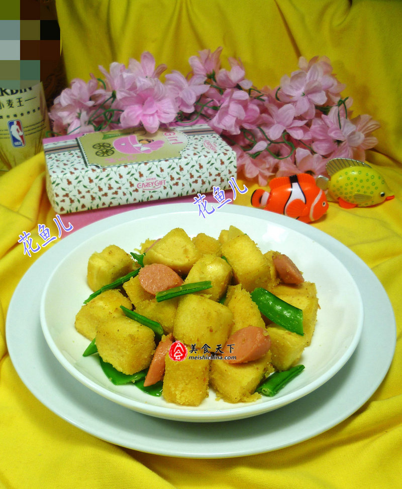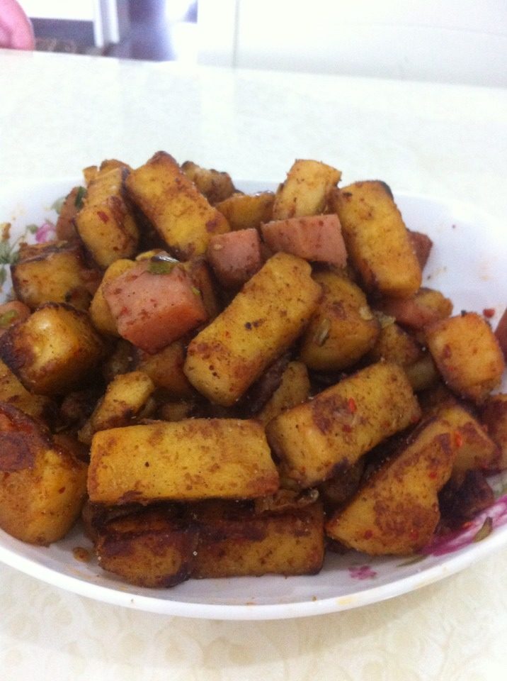 6:烧锅倒油烧热,下入切好的玉米馒头和火腿肠翻炒翻炒。
