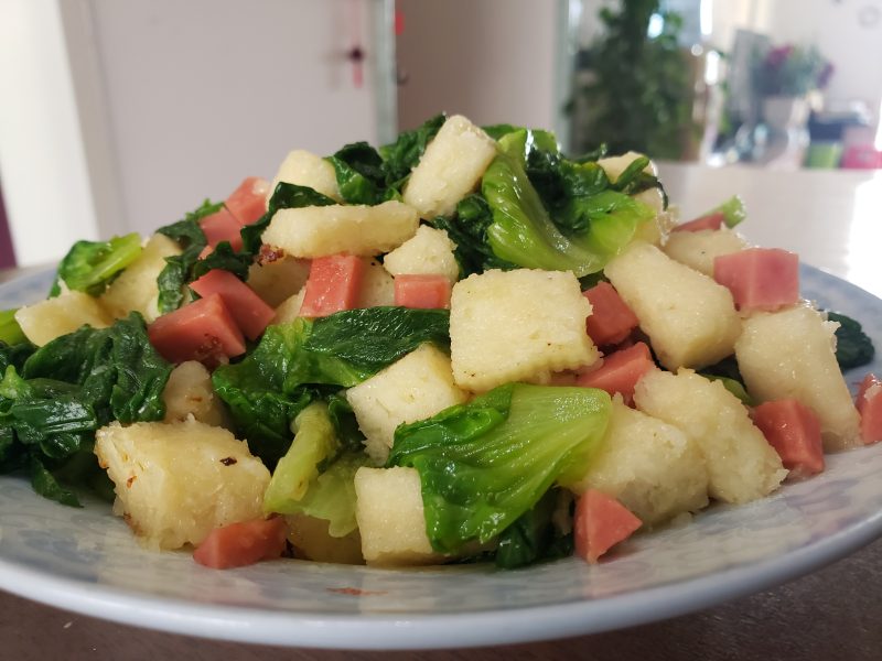 6:青菜熟的差不多了,加入鸡蛋液浸过的馒头块,翻炒