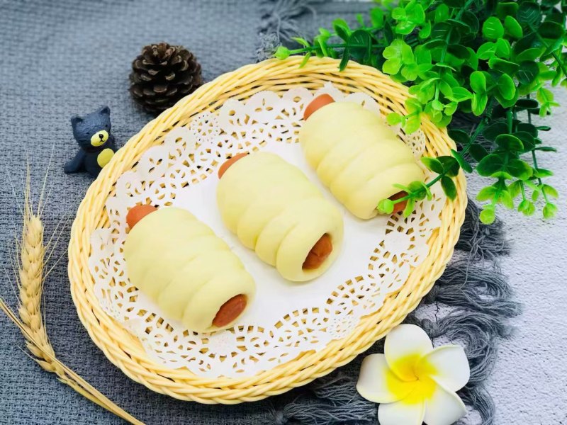 5:火腿肠一分为二,将长条的面缠绕火腿上,首尾固定好。