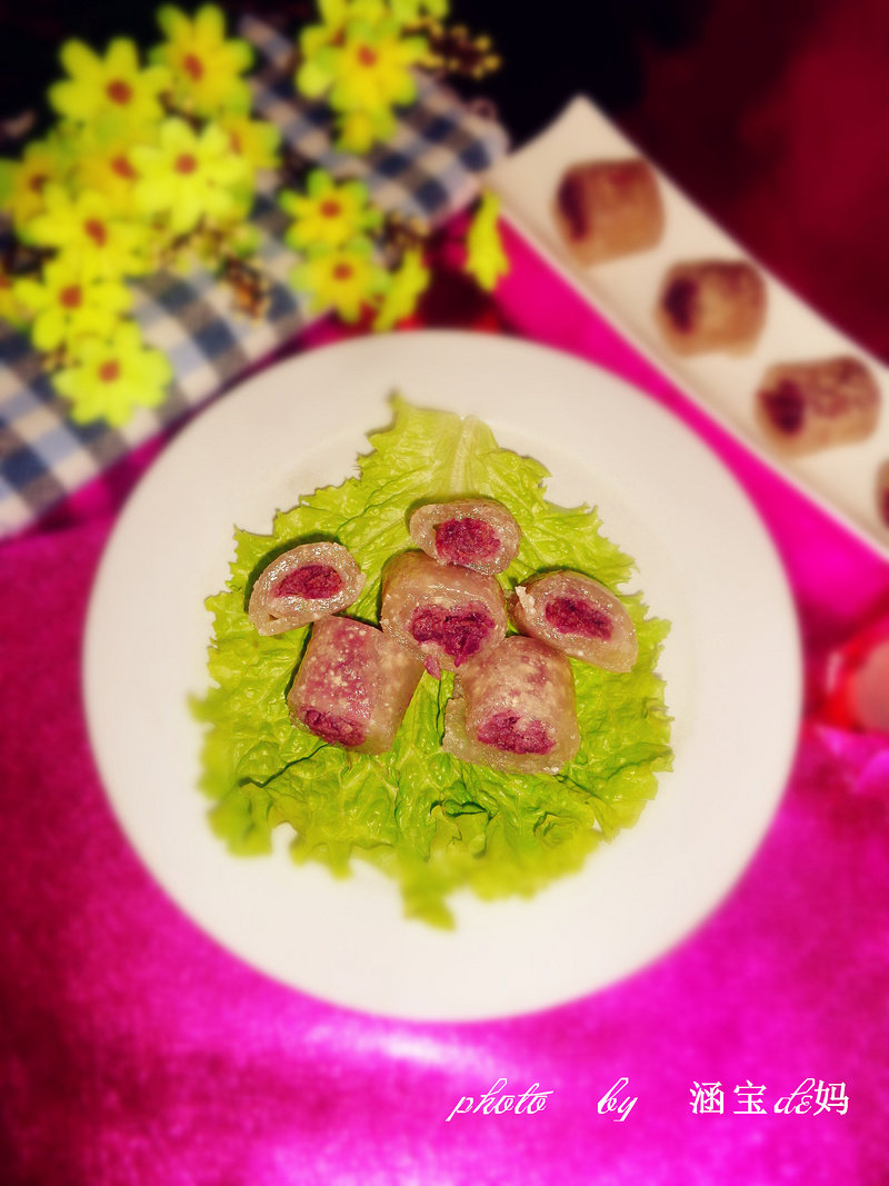 3:然后把弄好的西米用擀面杖弄出长条的宽度,中间可以放适量的紫薯,然后卷起来