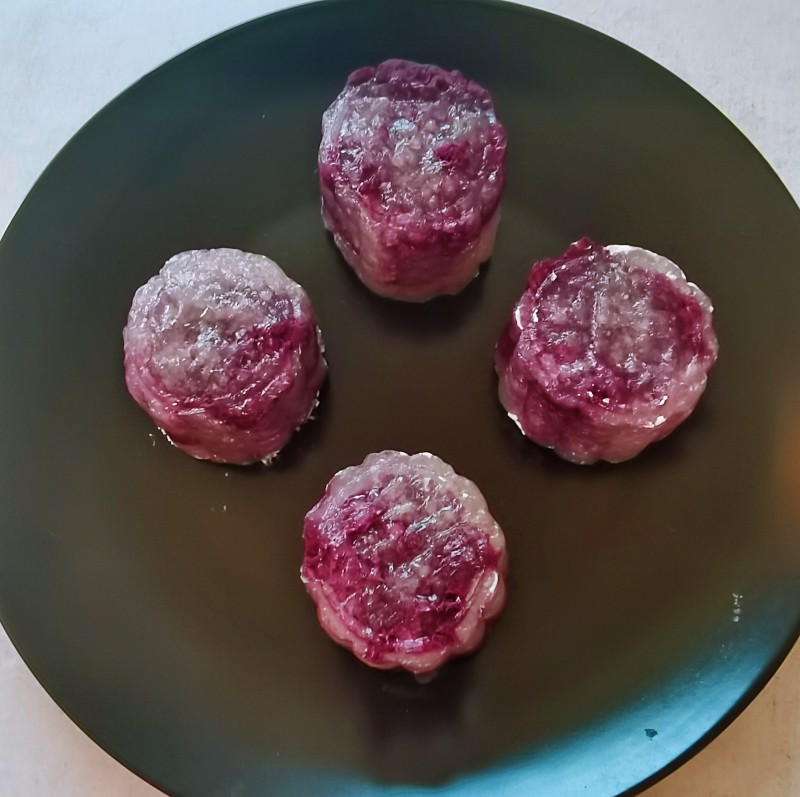 2:紫薯切粒蒸熟,蒸熟后捣成泥