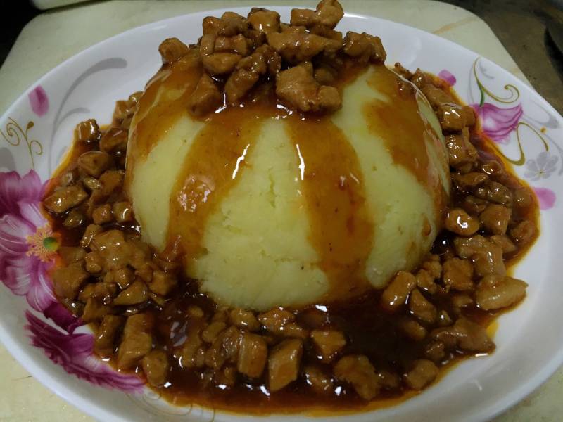 4:炒好的肉末浇在垒好的土豆泥上就可以吃了。