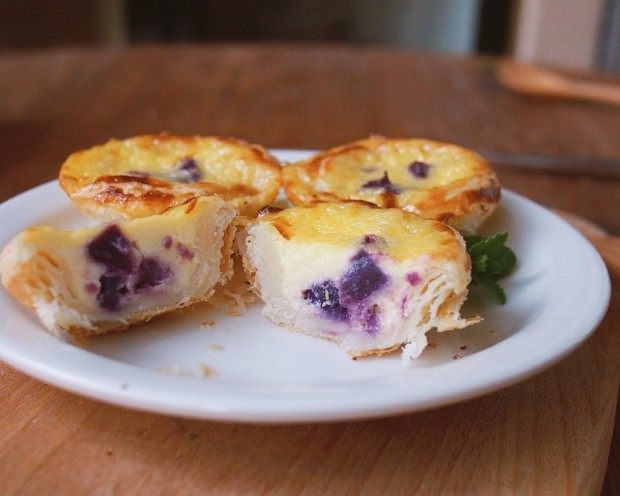 1:准备工作:将飞饼皮拿出晾晾软化,一包5个刚好可以做10个蛋挞。紫薯整熟去皮切成小块备用。
