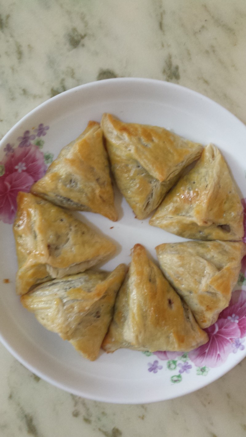 2:桌面撒一点干面粉,冰箱取出一片飞饼,一定要用一张取一张,飞饼在室温下很快就变软了,所以动作要快。把飞饼分成四份,每一份的中间放红豆馅,对折把边捏紧,最好用小叉子按压一下,时间紧迫,这一步没有拍到照片