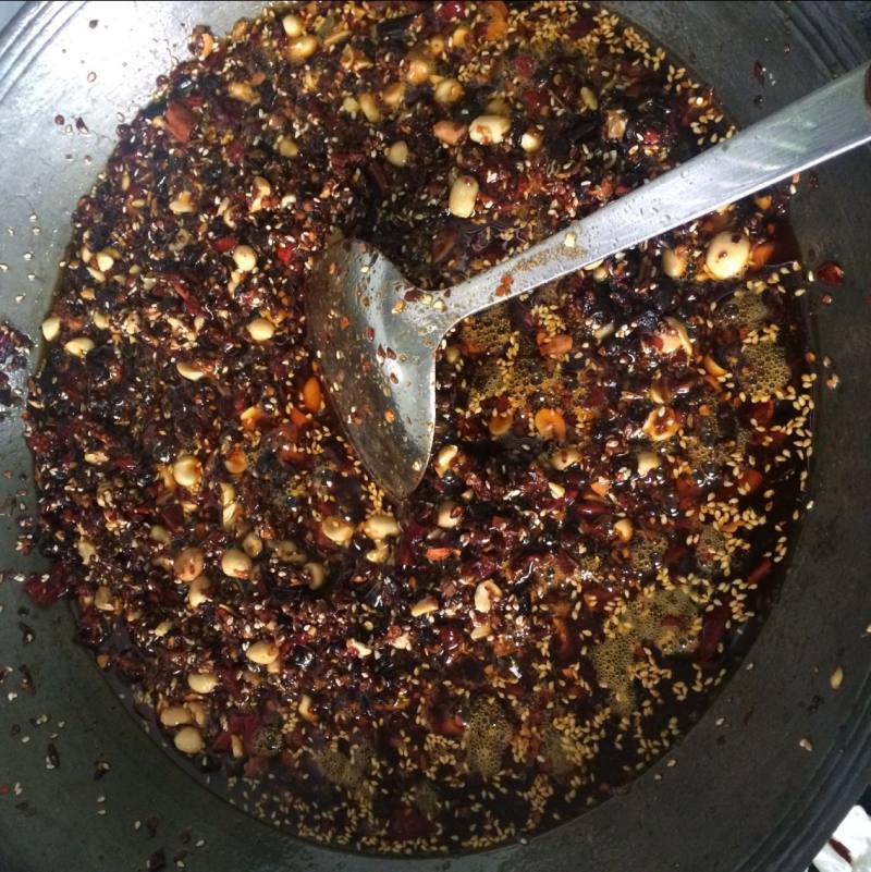 6:炒锅烧热放少许油,油没热时就放入辣椒,花椒炒香,再加辣椒油或香辣酱炒制,再放入葱花。