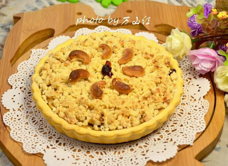 12:把冷冻的酥粒拿出来搓碎撒表面。最后弄几颗腰果装饰