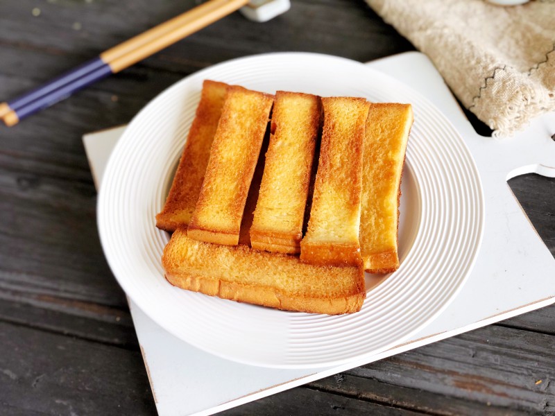 6:观察上色,吐司条表面呈焦黄色,就可以出炉了。