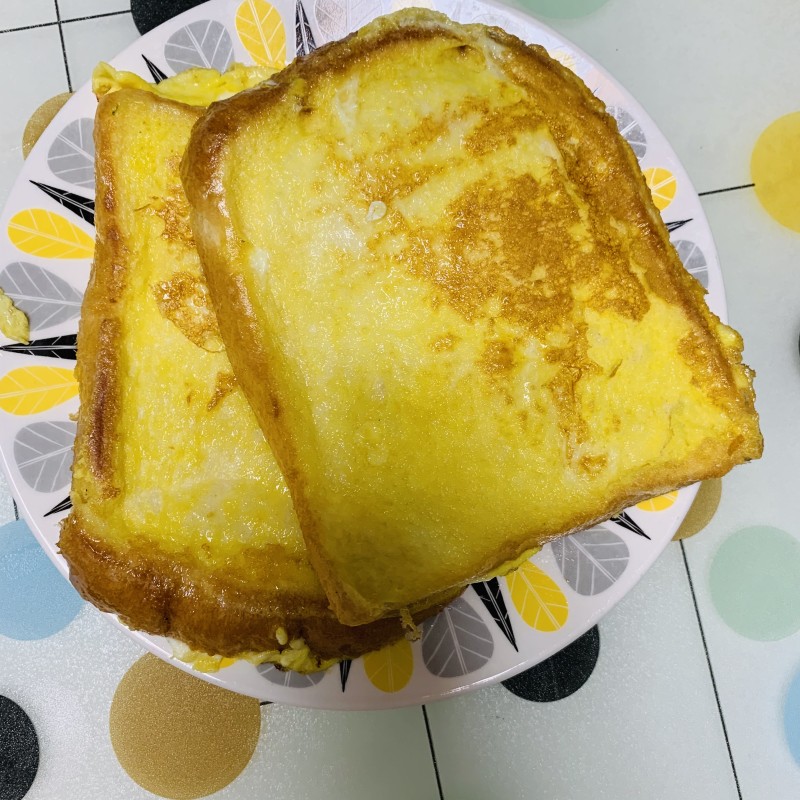 3:另外一面同样粘上鸡蛋液,做的吐司比较柔软,吸水性好,两面全部吃饱饱鸡蛋液就好了。