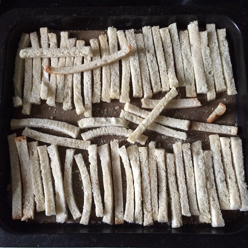3:见吐司条,均匀码放在烤盘中,要间隔一点的空隙,这样有利于水分蒸发。中层,上下火,135度烤10分钟,然后利用余热将多余水分蒸发。然后将彻底冷却的吐司条,放入密封容器中保存即可。