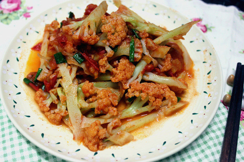 6:然后放入花菜翻炒加入盐鸡精和葱花就可以啦