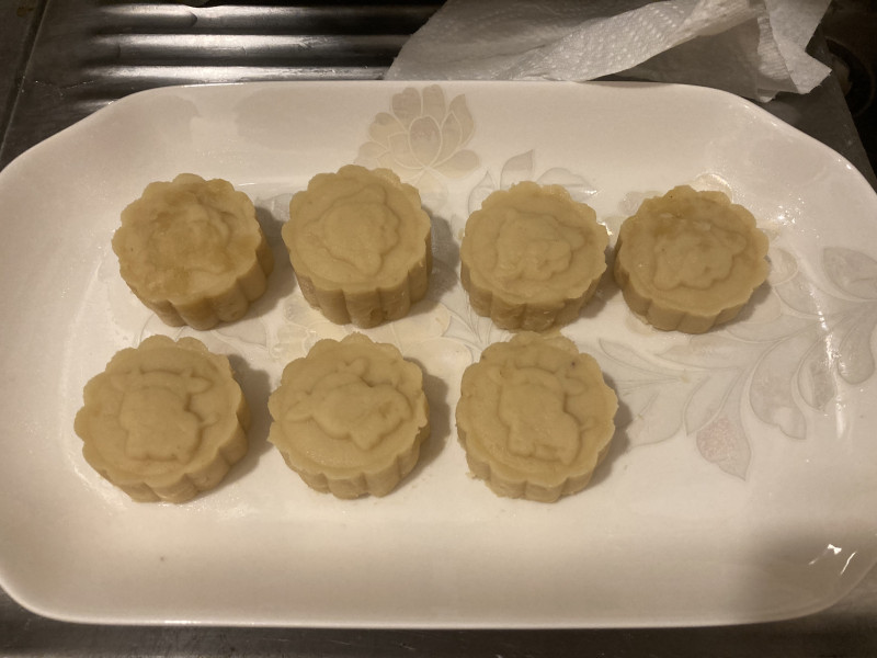 去皮绿豆提前一晚泡水。蒸绿豆时水不要加太多,不然炒绿豆泥的时间会很长。炒绿豆泥时用中小火,并且不停搅拌,防止炒糊。