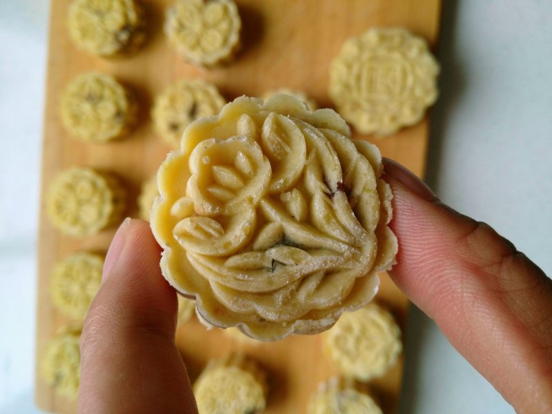 12:模具中也刷层油,把绿豆泥团成球,按入模具中。