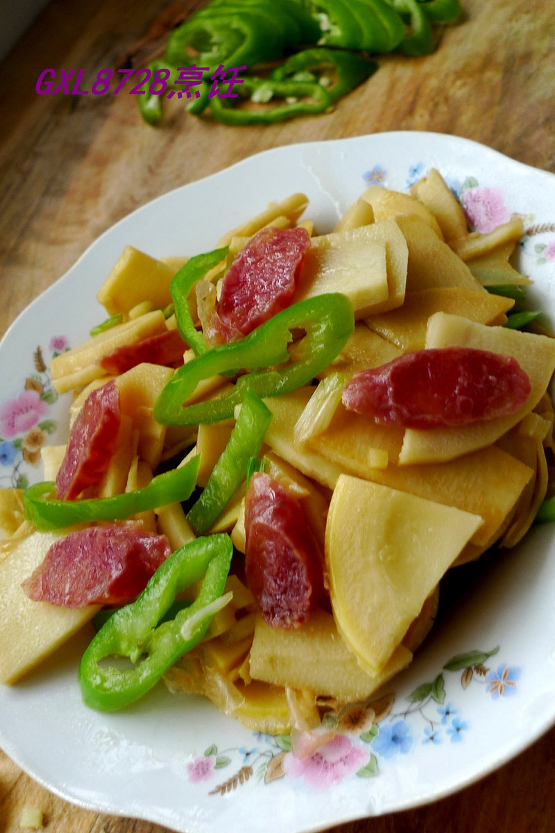 鲜笋250克;广式腊肠1根;青辣椒1个;