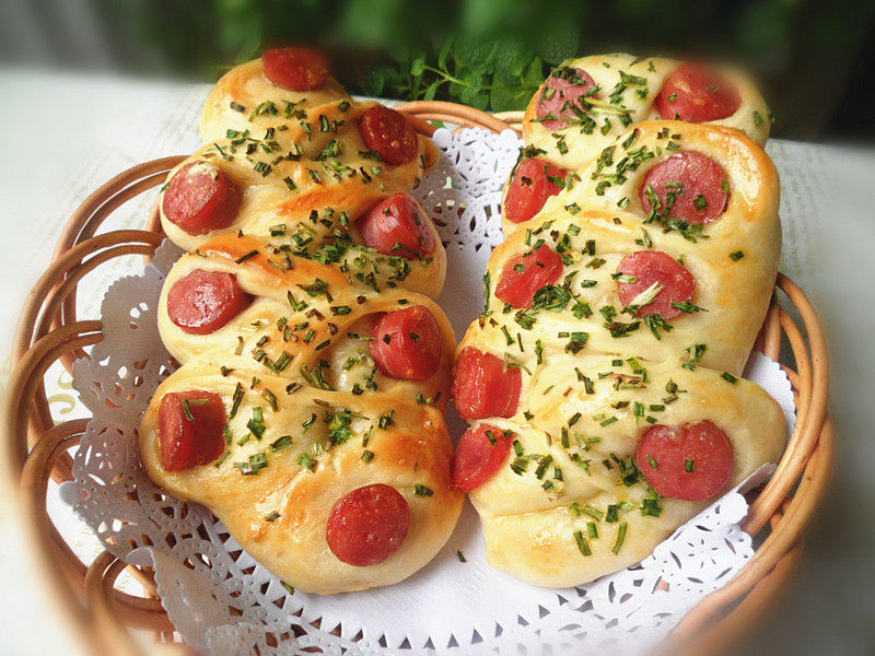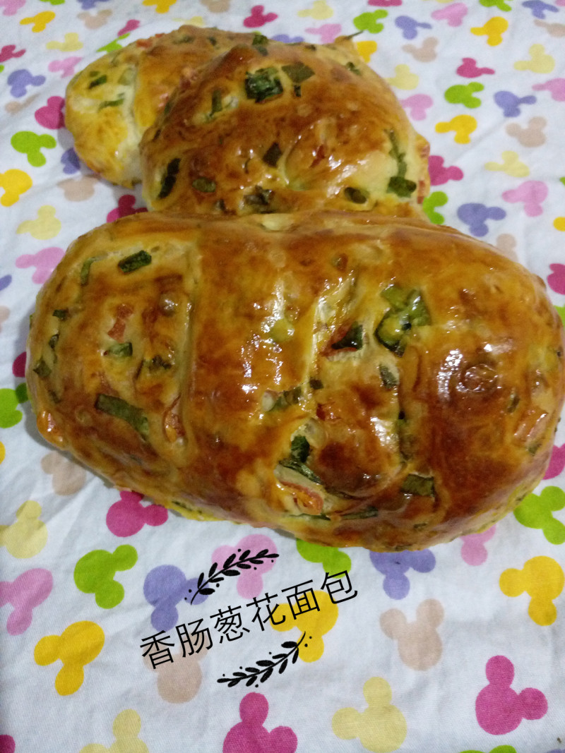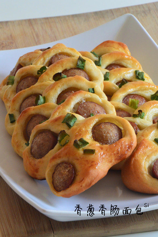 高筋面粉120g;低筋面粉30g;黄油8g;白砂糖10g;牛奶25ml;大葱10g;香肠2根;