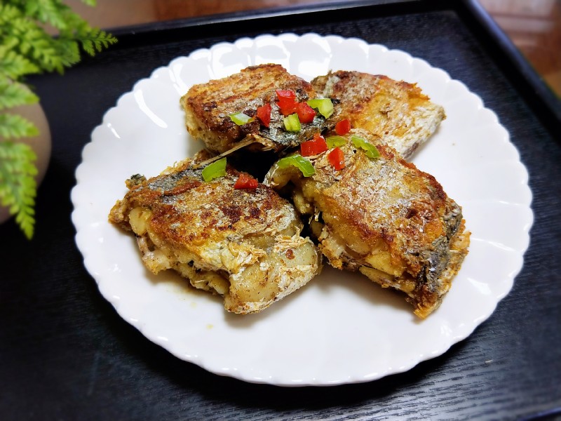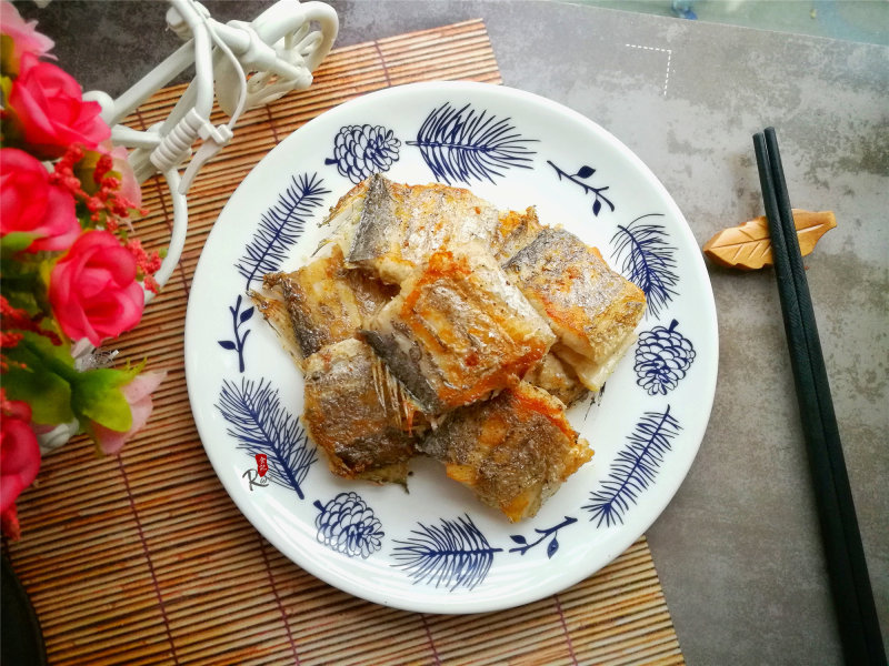 3:把带鱼块煎至两面都金黄,趁热撒上一些椒盐或自己喜欢的调味料,翻拌均匀。