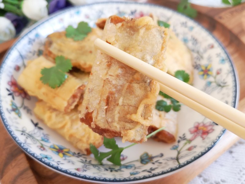 7:锅中烧油,放入干燥木筷周围冒小泡时放入带鱼炸至两面金黄即可。