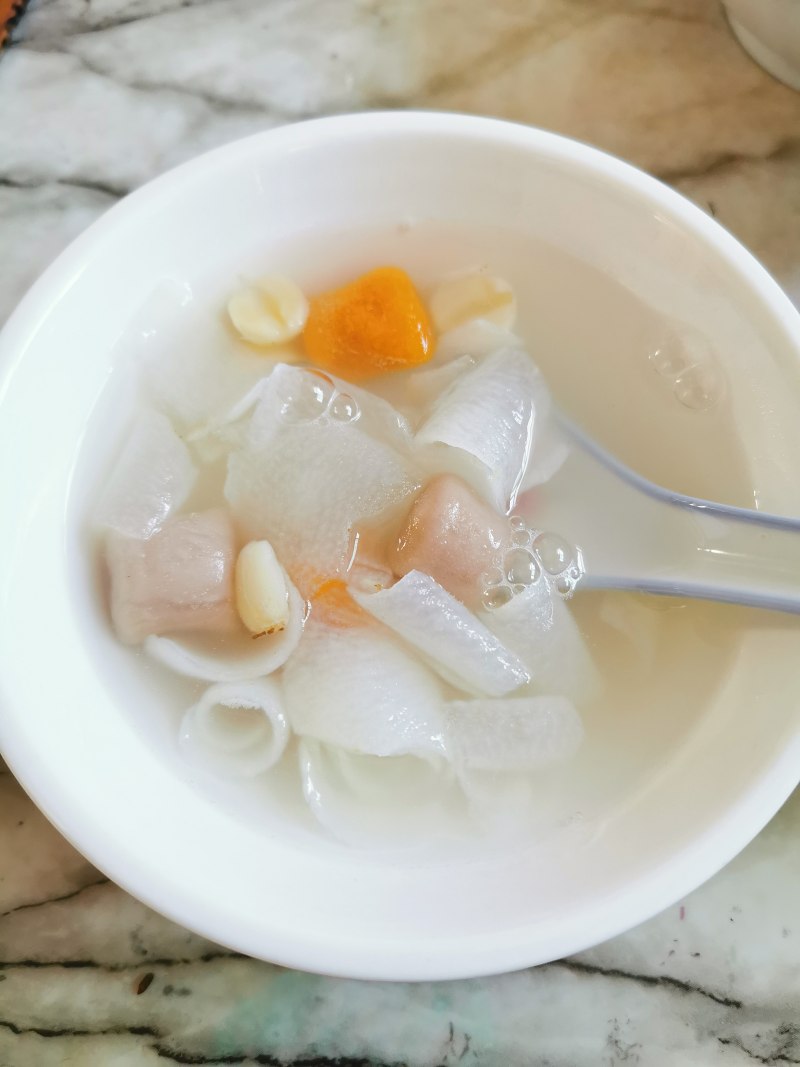 6:水煮开一会就可以了,削薄片的姜薯会卷起来。