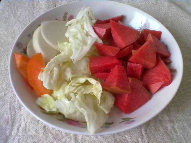 1:白菜、萝卜、菜椒、胡萝卜清洗沥干水分