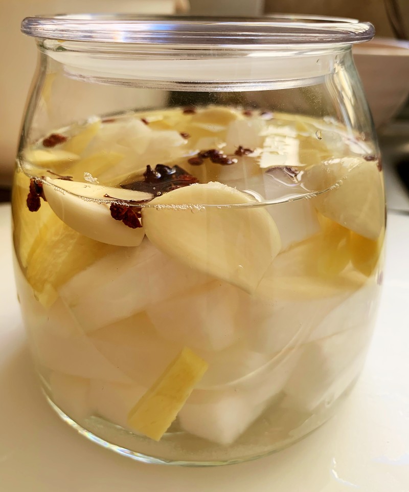 2:玻璃罐清洗干净,沥干水分。干净无油的锅,加水烧开,水中加花椒放凉。放凉的水倒进无水无油的玻璃罐里面,加些盐、姜片、蒜瓣、冰糖、白酒。萝卜切片,白菜菜椒手撕成块。装进玻璃罐中